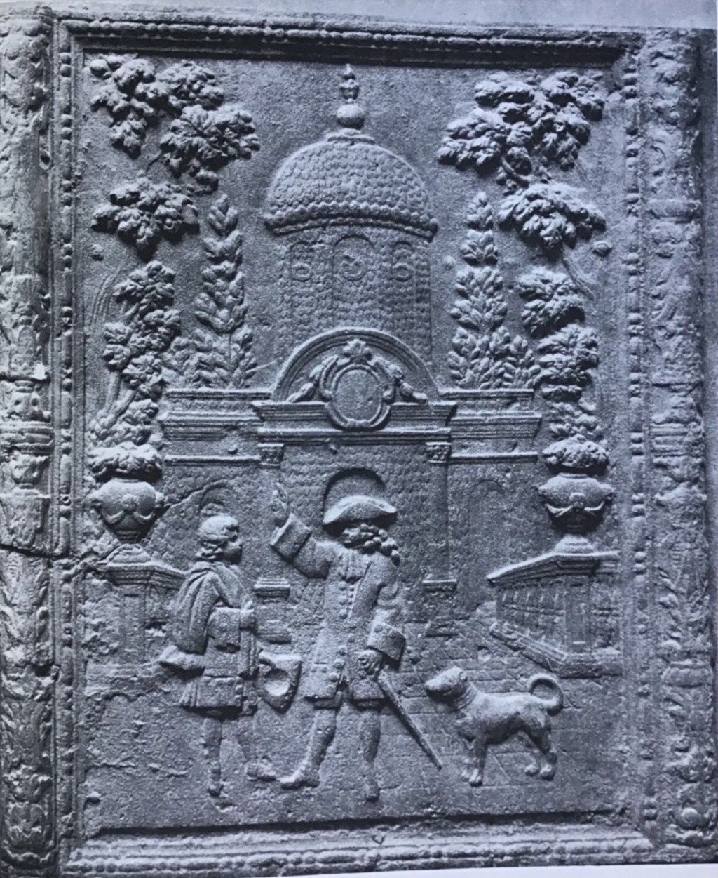 3. Langside plate til ovn. Faraos datter finner Moses i kurv i elvesivet. Trær, og i bakgrunnen slott og hus. Mål ikke oppgitt. (N.N. 6,49). Vekt ca. 3 Skippund x 160 kg = 480 kg. (Total vekt, komplett ovn). Sideplate på Jarlsberg Hovedgård.